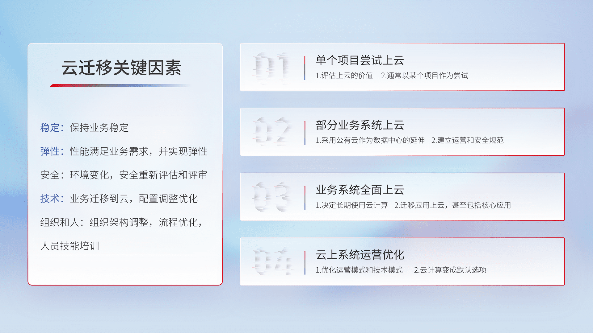 结合实际业务,,,从规划设计、、云平台选型、、、、云原生改造、、、、数据迁移、、、集成交付,,,迁移全过程为客户识别最佳上云路径,,做好风险识别管理,,设计网络架构、、、、身份权限、、、、安全审计合规、、操作审计、、、、日志审计、、、、监控告警策略、、多站点容灾设计等,,,对云上基础设施进行整体规划,,提升IT治理水平,,,以满足弹性、、、、高可用、、、、高性能的需求。。。