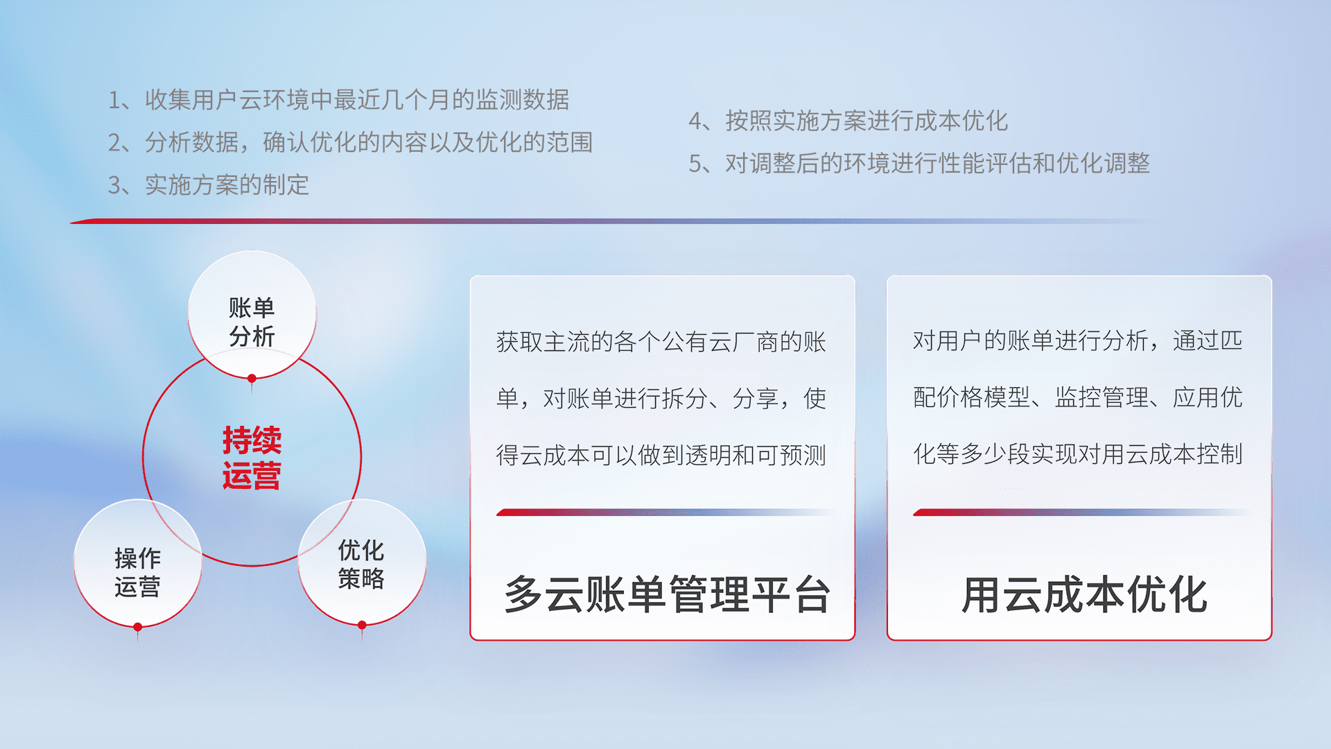 通过多云纳管,,以统一的资源数据模型把客户的云资源进行抽象和封装,,,进而实现对多云资源的统一操作,,保障云资源管理的可靠性、、、、稳定性与可用性。。量身定制化运维内容,,,配置、、、开发运维、、、、补丁管理、、备份、、监控、、认证和访问管理、、审计和日常巡检等,,,,保障在用云过程中的可靠度,,稳定度以及高可用率。。。。